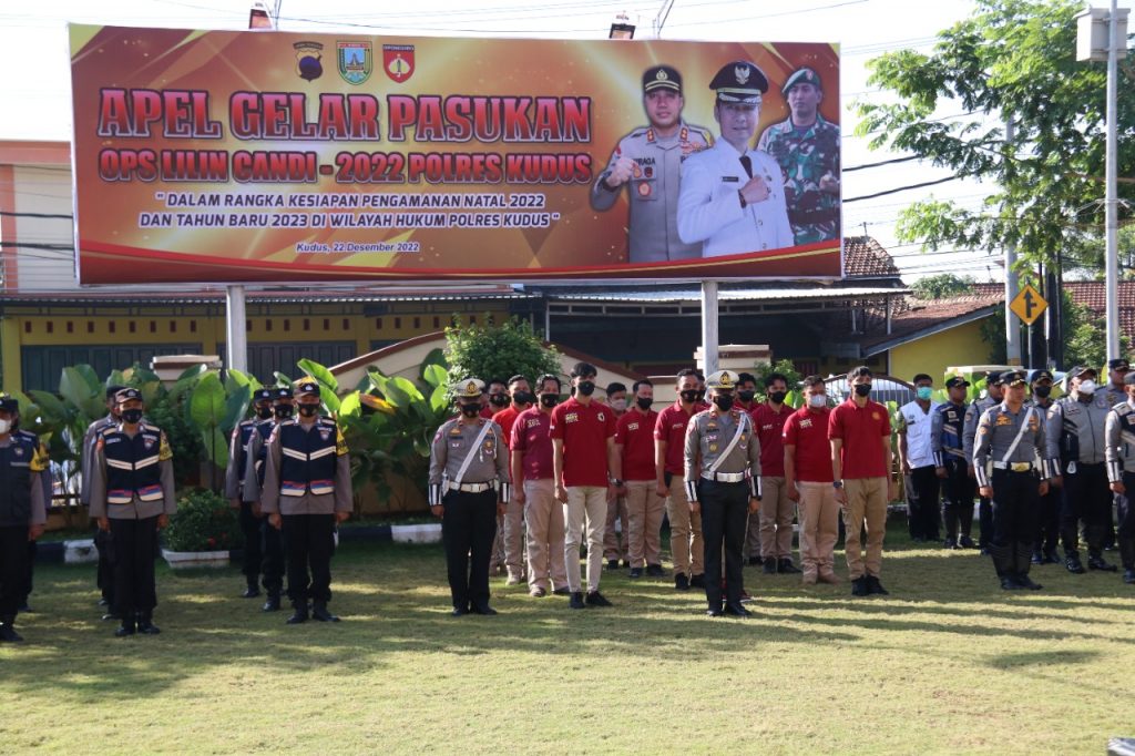 Polres Kudus melaksanakan apel gelar pasukan “Operasi Lilin Candi 2022” pagi ini dalam rangka untuk mengantisipasi gangguan Kamtibmas kamseltibcar lantas dan pelanggaran protokol kesehatan Covid-19 jelang Natal dan tahun baru 2023 serta memastikan kesiapsiagaan personel dan peralatan pengamanan, serta soliditas para pemangku kepentingan.