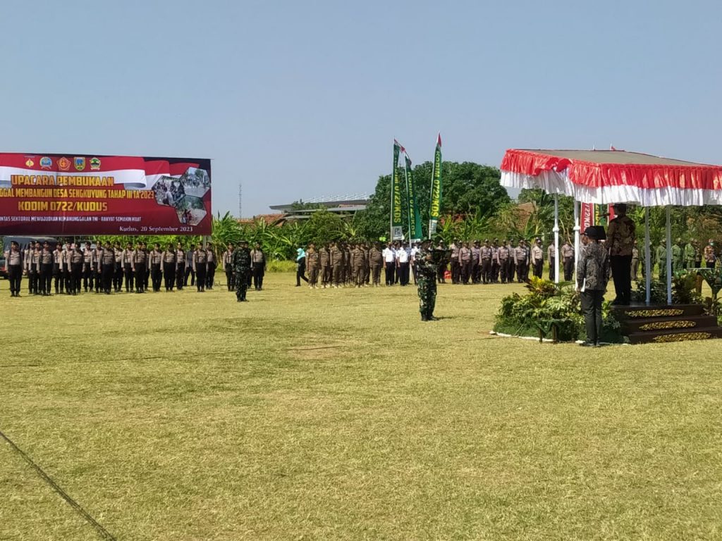 Kudus – Wakapolres Kudus Kompol Satya Adi Nugraha menghadiri kegiatan pembukaan TMMD (Tentara Manunggal Membangun Desa) Sengkuyung III Tahun 2023 yang dilaksanakan di lapangan sepak bola Desa Pedawang Kecamatan Bae, Kudus, Rabu (20/9/2023).