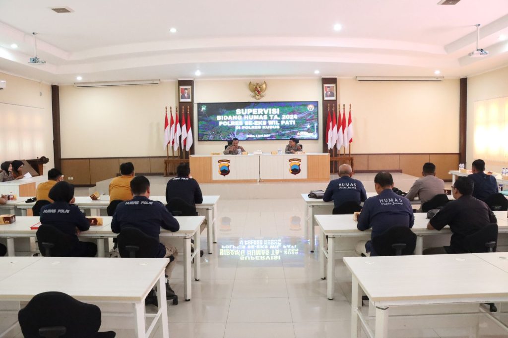 Kudus – Bidang Humas Polda Jateng yang dipimpin oleh Kasubbid Mulmed Bid Humas Polda Jateng, AKBP Priyo Handoko melakukan supervisi yang berlangsung di Aula Paramasatwika Polres Kudus, Rabu (5/6/2024).