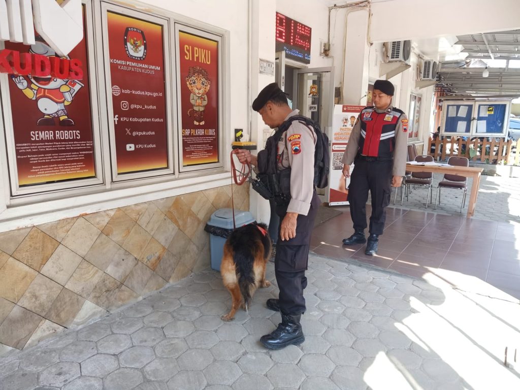Polres Kudus – Polda Jateng – Polres Kudus menerjunkan anjing pelacak untuk melakukan sterilisasi di kantor KPU dan Bawaslu Kudus.