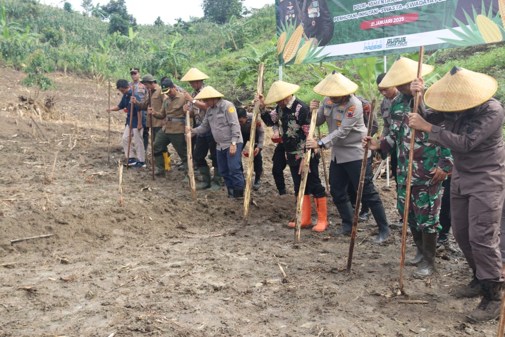 Dalam rangka mendukung Program strategis Pemerintah, tentang program ketahanan pangan nasional, Polres Kudus menggelar kegiatan penanaman Jagung serentak 1 Juta Hektar yan berlokasi di pegunungan Pati Ayam Desa Terban Kecamatan Jekulo Kudus, Selasa (21/1/25) pagi