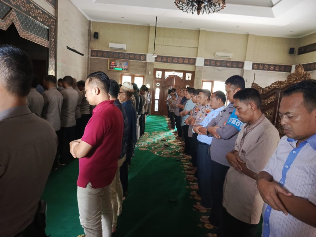 Polres Kudus – Polda Jateng. Sebagai bentuk penghormatan dan doa bagi tiga personel Polri yang gugur dalam menjalankan tugas di Polres Way Kanan, Polda Lampung, jajaran Polres Kudus menggelar Sholat Gaib usai sholat Dzuhur di Masjid Al-Quds Polres Kudus. Selasa (18/3/2025).