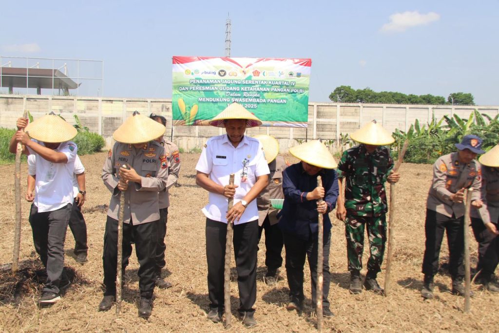Kudus – Dalam mendukung program Swasembada Pangan Nasional Tahun 2025, Kapolres Kudus AKBP Heru Dwi Purnomo bersama jajaran Forkopimda Kabupaten Kudus melaksanakan kegiatan Penanaman Jagung Serentak Kuartal IV Tahun 2025, yang dipusatkan di lahan pertanian Desa Rendeng, Kecamatan Kota, Kudus, Rabu (8/10).